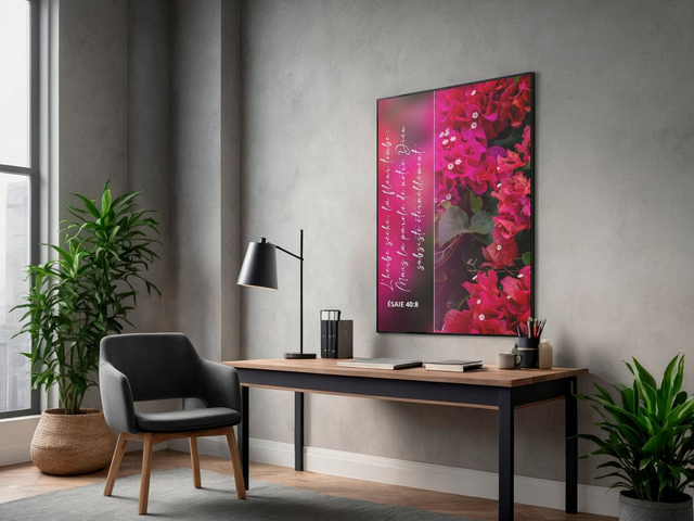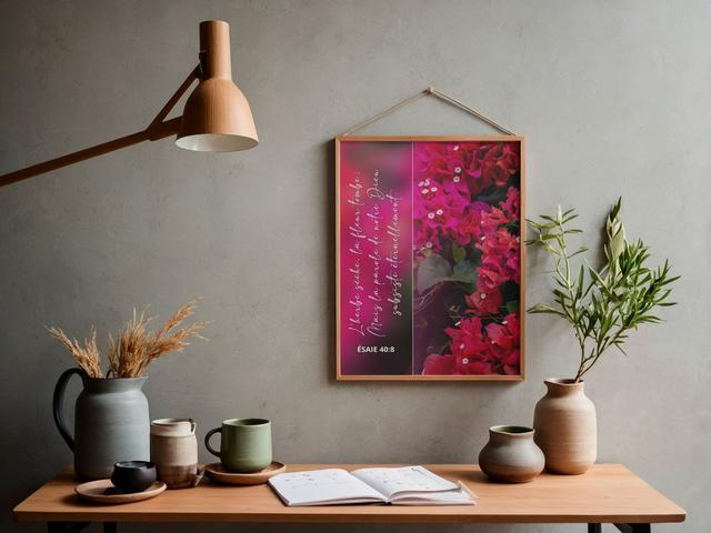 Une création lumineuse et apaisante mettant en valeur la beauté éphémère de la nature et la force intemporelle de la Parole. Les fleurs fuchsia éclatantes soulignent avec douceur ce verset puissant :