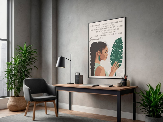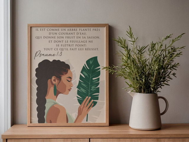 Affiche décorative chrétienne mettant en valeur la croissance, la foi et la réussite à travers une illustration féminine raffinée. Un visuel inspirant pour un intérieur empreint de sens.