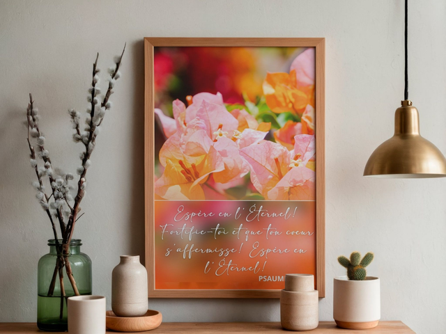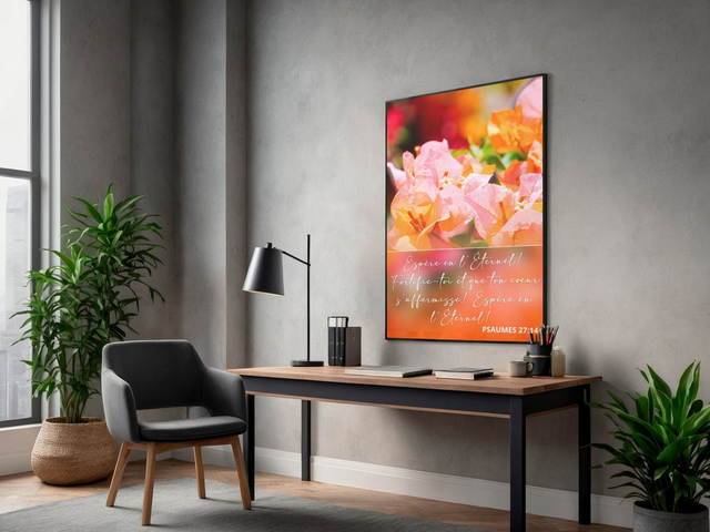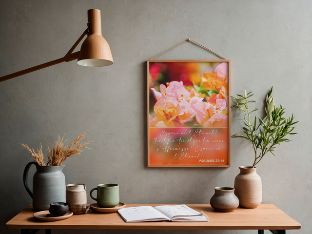 Affiche chrétienne chaleureuse illustrant le verset Psaumes 27:14, invitant à l’espérance, à la confiance et au courage. Parfaite pour un espace de prière ou de méditation.